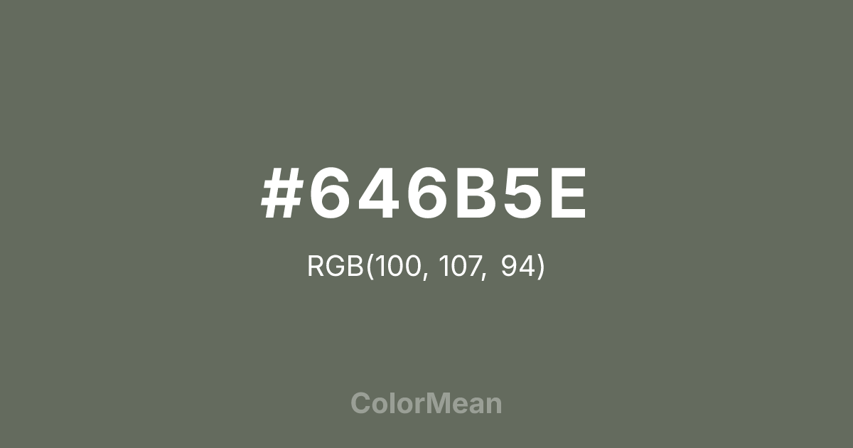 #646B5E RGB value is (100, 107, 94). The hex color red value is 100, green is 107, and blue is 94. Its HSL format shows a hue of 92°, saturation of 6 percent, and lightness of 39 percent. The CMYK process values are 7 percent, 0 percent, 12 percent, 58 percent.