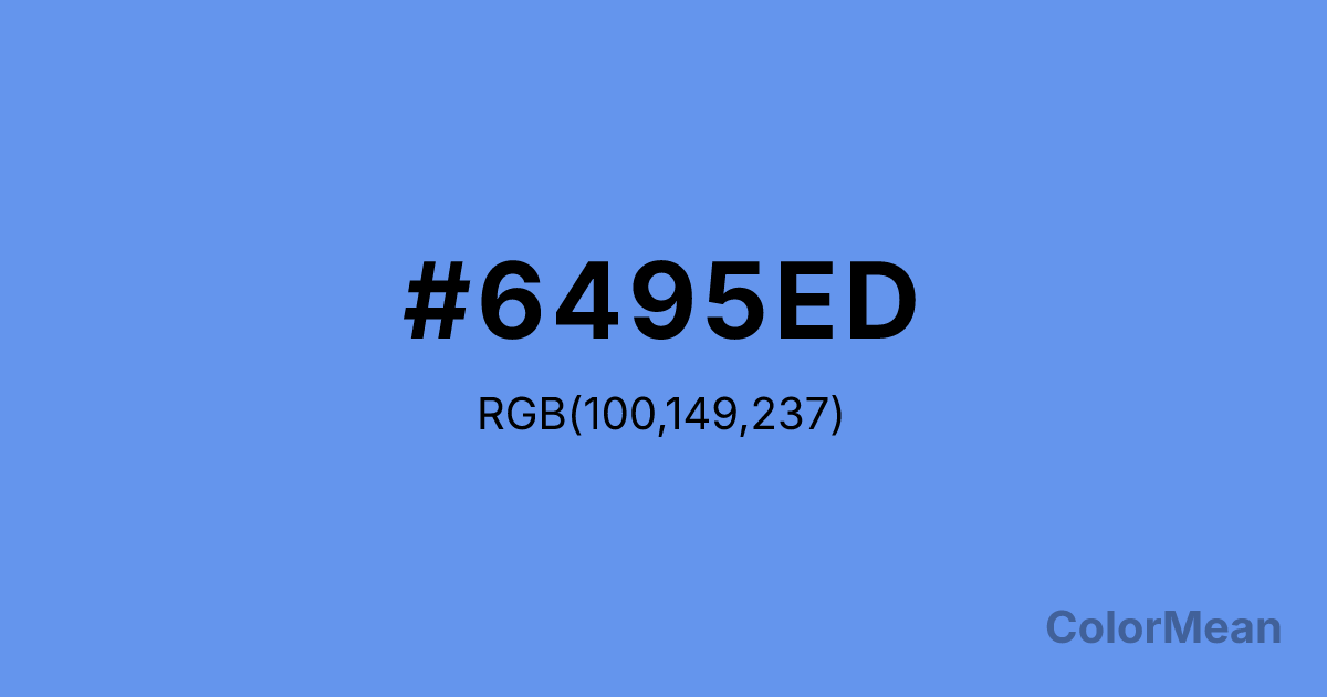 Cornflower (#6495ED) RGB value is (100, 149, 237). The hex color red value is 100, green is 149, and blue is 237. Its HSL format shows a hue of 219°, saturation of 79 percent, and lightness of 66 percent. The CMYK process values are 58 percent, 37 percent, 0 percent, 7 percent.