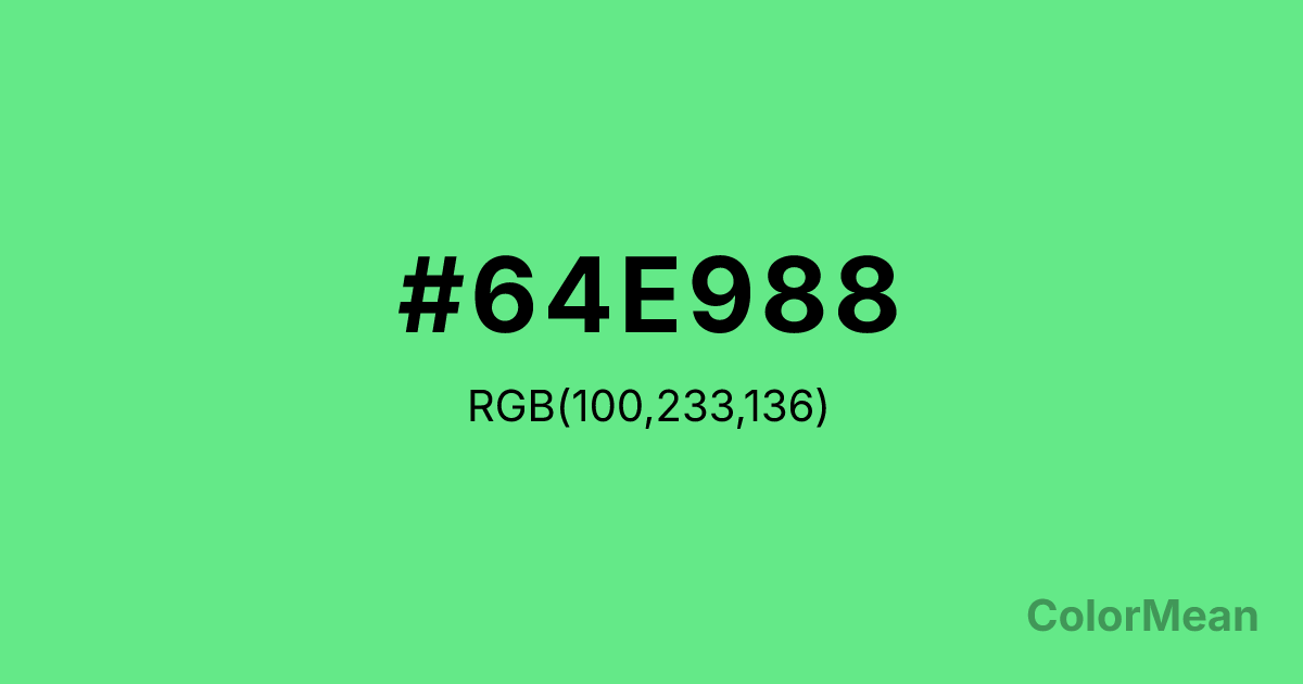 #64E988 RGB value is (100, 233, 136). The hex color red value is 100, green is 233, and blue is 136. Its HSL format shows a hue of 136°, saturation of 75 percent, and lightness of 65 percent. The CMYK process values are 57 percent, 0 percent, 42 percent, 9 percent.