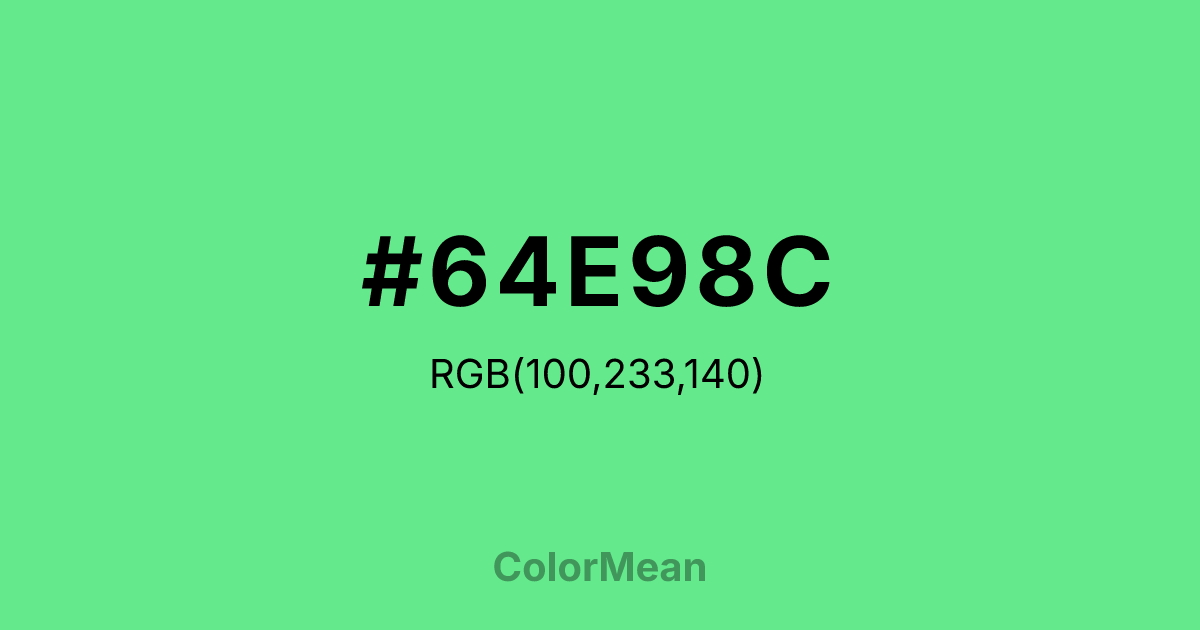 #64E98C RGB value is (100, 233, 140). The hex color red value is 100, green is 233, and blue is 140. Its HSL format shows a hue of 138°, saturation of 75 percent, and lightness of 65 percent. The CMYK process values are 57 percent, 0 percent, 40 percent, 9 percent.