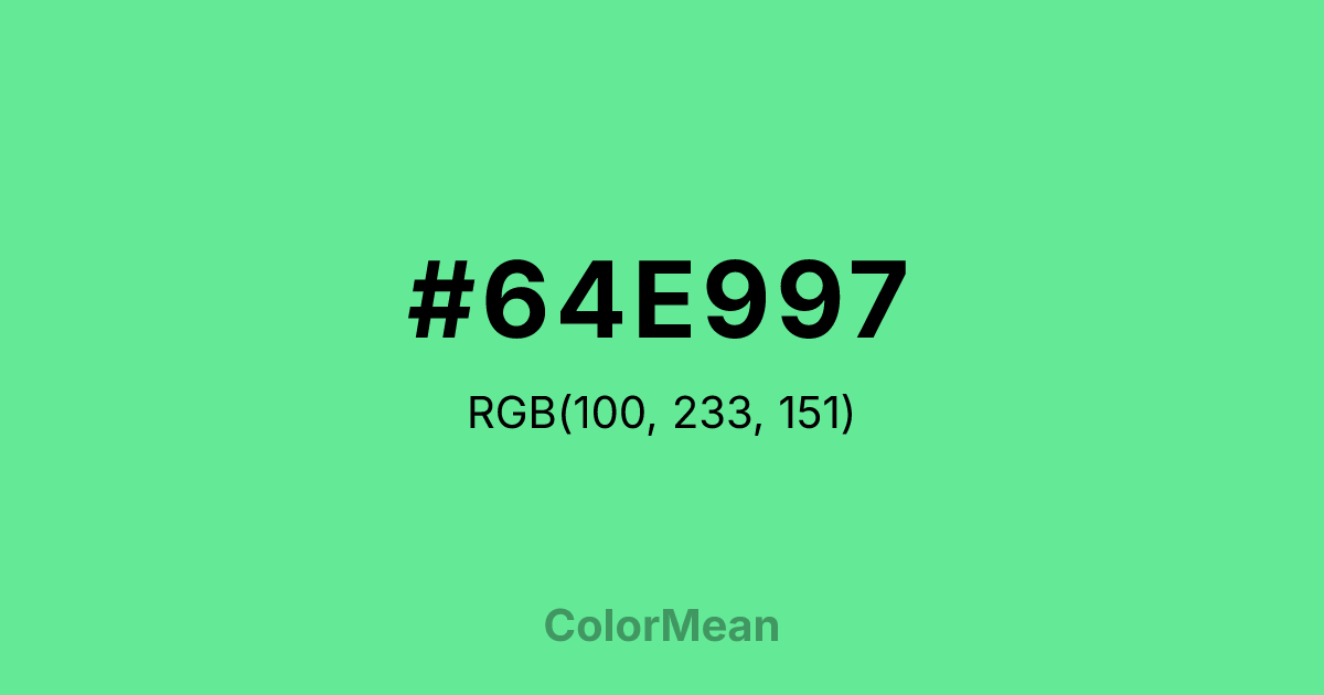 #64E997 RGB value is (100, 233, 151). The hex color red value is 100, green is 233, and blue is 151. Its HSL format shows a hue of 143°, saturation of 75 percent, and lightness of 65 percent. The CMYK process values are 57 percent, 0 percent, 35 percent, 9 percent.