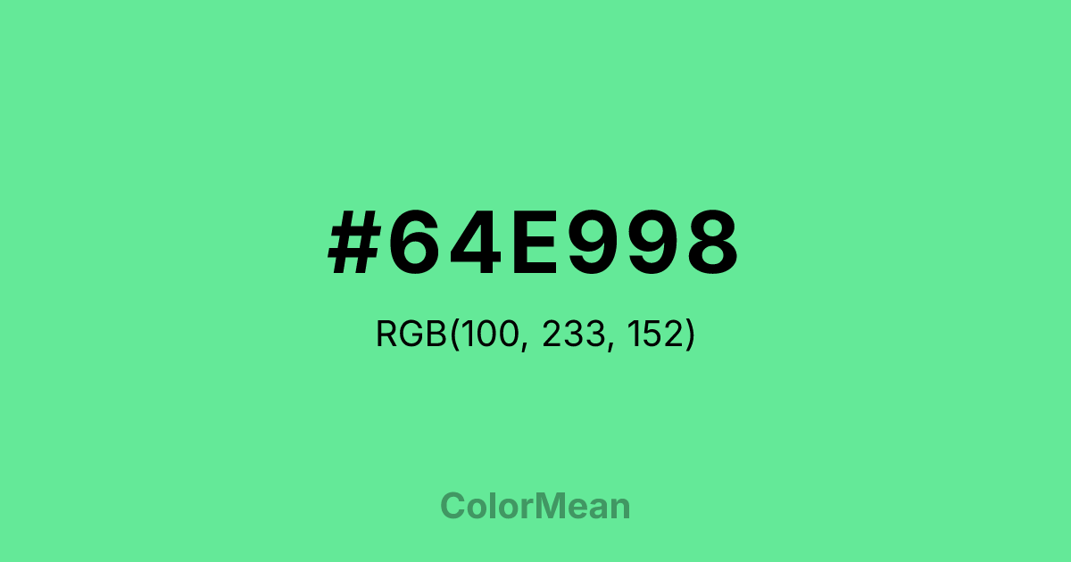 #64E998 RGB value is (100, 233, 152). The hex color red value is 100, green is 233, and blue is 152. Its HSL format shows a hue of 143°, saturation of 75 percent, and lightness of 65 percent. The CMYK process values are 57 percent, 0 percent, 35 percent, 9 percent.