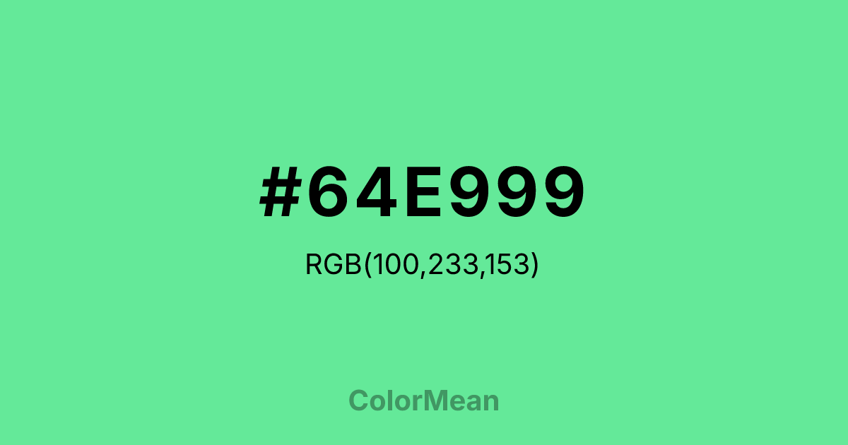 #64E999 RGB value is (100, 233, 153). The hex color red value is 100, green is 233, and blue is 153. Its HSL format shows a hue of 144°, saturation of 75 percent, and lightness of 65 percent. The CMYK process values are 57 percent, 0 percent, 34 percent, 9 percent.