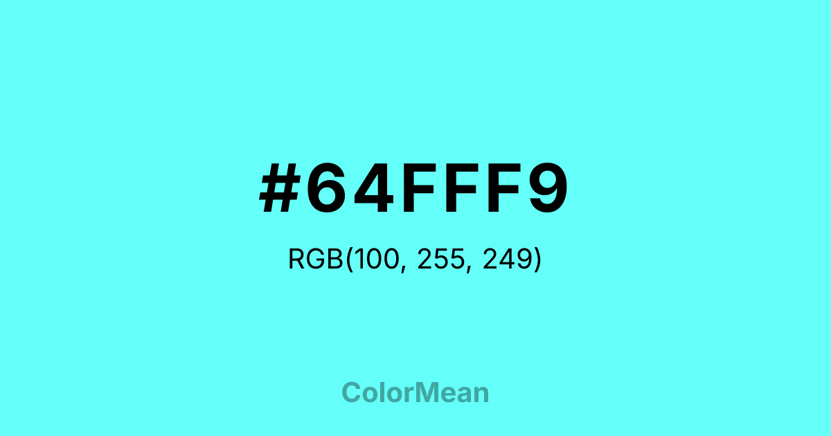 #64FFF9 RGB value is (100, 255, 249). The hex color red value is 100, green is 255, and blue is 249. Its HSL format shows a hue of 178°, saturation of 100 percent, and lightness of 70 percent. The CMYK process values are 61 percent, 0 percent, 2 percent, 0 percent.