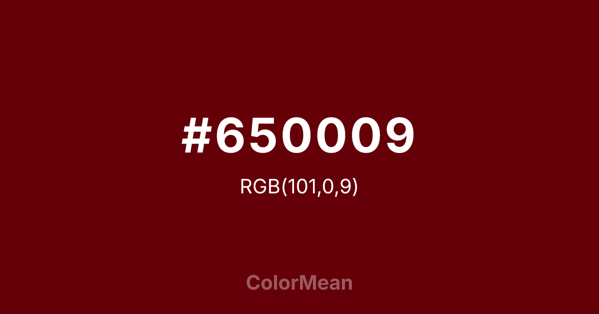 #650009 RGB value is (101, 0, 9). The hex color red value is 101, green is 0, and blue is 9. Its HSL format shows a hue of 355°, saturation of 100 percent, and lightness of 20 percent. The CMYK process values are 0 percent, 100 percent, 91 percent, 60 percent.