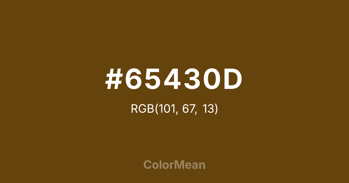 #65430D RGB value is (101, 67, 13). The hex color red value is 101, green is 67, and blue is 13. Its HSL format shows a hue of 37°, saturation of 77 percent, and lightness of 22 percent. The CMYK process values are 0 percent, 34 percent, 87 percent, 60 percent.