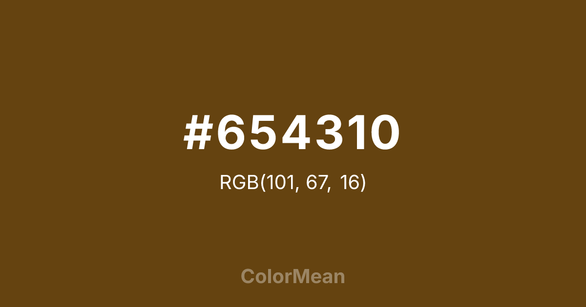 #654310 RGB value is (101, 67, 16). The hex color red value is 101, green is 67, and blue is 16. Its HSL format shows a hue of 36°, saturation of 73 percent, and lightness of 23 percent. The CMYK process values are 0 percent, 34 percent, 84 percent, 60 percent.