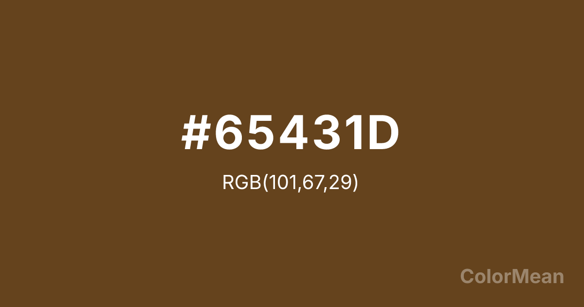 #65431D RGB value is (101, 67, 29). The hex color red value is 101, green is 67, and blue is 29. Its HSL format shows a hue of 32°, saturation of 55 percent, and lightness of 25 percent. The CMYK process values are 0 percent, 34 percent, 71 percent, 60 percent.