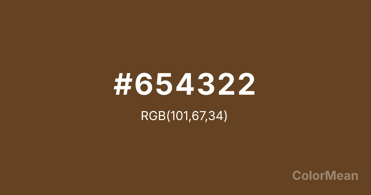 #654322 RGB value is (101, 67, 34). The hex color red value is 101, green is 67, and blue is 34. Its HSL format shows a hue of 30°, saturation of 50 percent, and lightness of 26 percent. The CMYK process values are 0 percent, 34 percent, 66 percent, 60 percent.