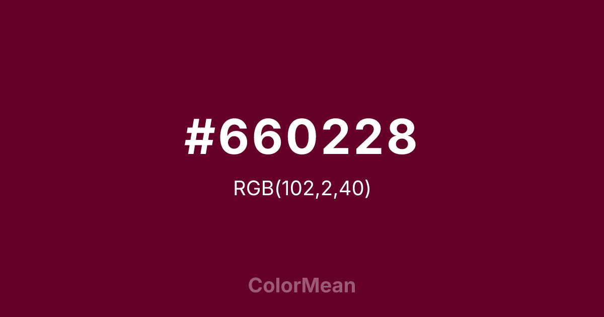 #660228 RGB value is (102, 2, 40). The hex color red value is 102, green is 2, and blue is 40. Its HSL format shows a hue of 337°, saturation of 96 percent, and lightness of 20 percent. The CMYK process values are 0 percent, 98 percent, 61 percent, 60 percent.