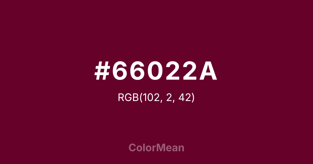 #66022A RGB value is (102, 2, 42). The hex color red value is 102, green is 2, and blue is 42. Its HSL format shows a hue of 336°, saturation of 96 percent, and lightness of 20 percent. The CMYK process values are 0 percent, 98 percent, 59 percent, 60 percent.