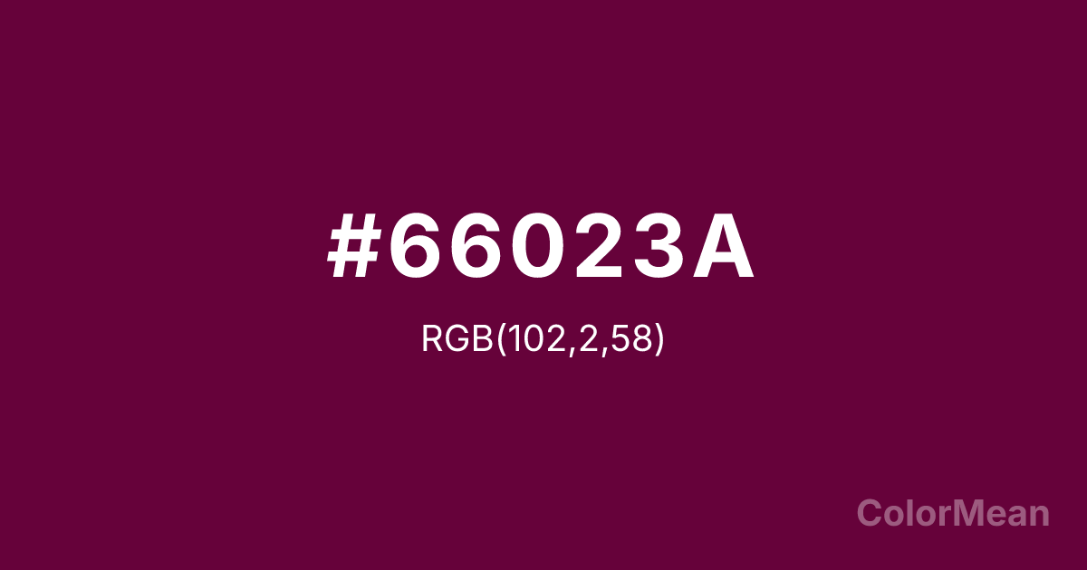 #66023A RGB value is (102, 2, 58). The hex color red value is 102, green is 2, and blue is 58. Its HSL format shows a hue of 326°, saturation of 96 percent, and lightness of 20 percent. The CMYK process values are 0 percent, 98 percent, 43 percent, 60 percent.