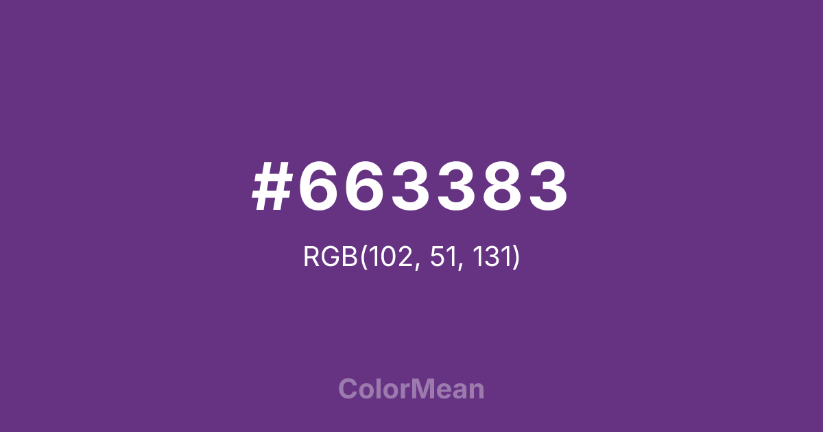 #663383 RGB value is (102, 51, 131). The hex color red value is 102, green is 51, and blue is 131. Its HSL format shows a hue of 278°, saturation of 44 percent, and lightness of 36 percent. The CMYK process values are 22 percent, 61 percent, 0 percent, 49 percent.