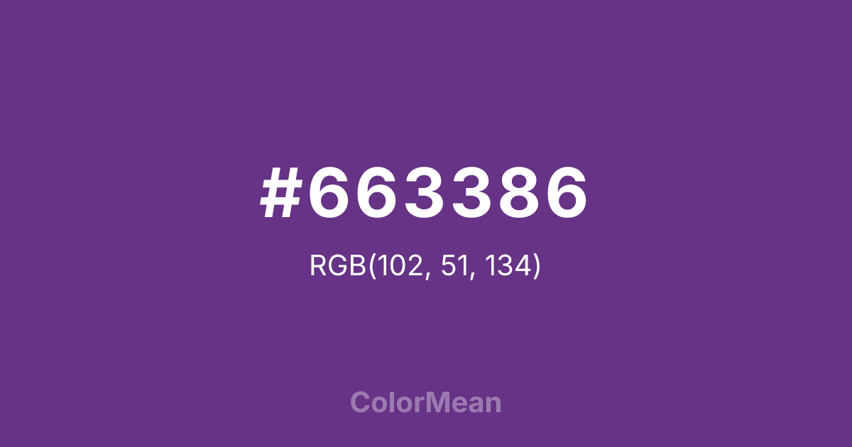 #663386 RGB value is (102, 51, 134). The hex color red value is 102, green is 51, and blue is 134. Its HSL format shows a hue of 277°, saturation of 45 percent, and lightness of 36 percent. The CMYK process values are 24 percent, 62 percent, 0 percent, 47 percent.