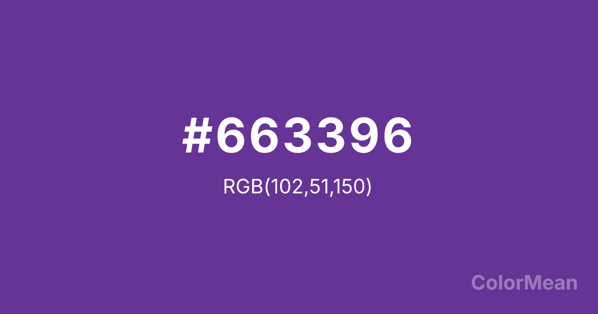 #663396 RGB value is (102, 51, 150). The hex color red value is 102, green is 51, and blue is 150. Its HSL format shows a hue of 271°, saturation of 49 percent, and lightness of 39 percent. The CMYK process values are 32 percent, 66 percent, 0 percent, 41 percent.