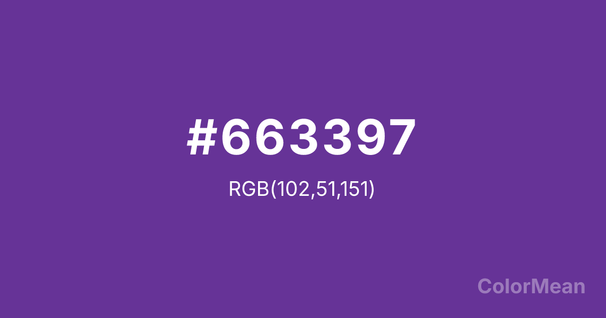 #663397 RGB value is (102, 51, 151). The hex color red value is 102, green is 51, and blue is 151. Its HSL format shows a hue of 271°, saturation of 50 percent, and lightness of 40 percent. The CMYK process values are 32 percent, 66 percent, 0 percent, 41 percent.