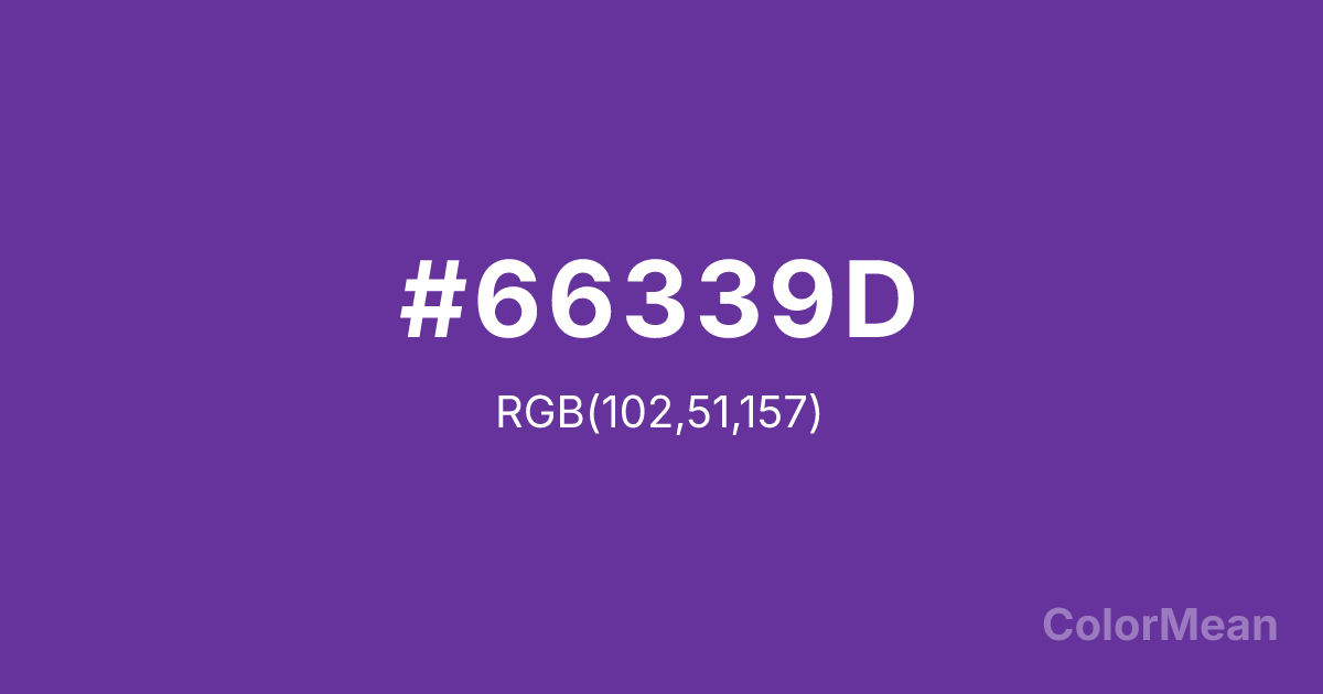 #66339D RGB value is (102, 51, 157). The hex color red value is 102, green is 51, and blue is 157. Its HSL format shows a hue of 269°, saturation of 51 percent, and lightness of 41 percent. The CMYK process values are 35 percent, 68 percent, 0 percent, 38 percent.
