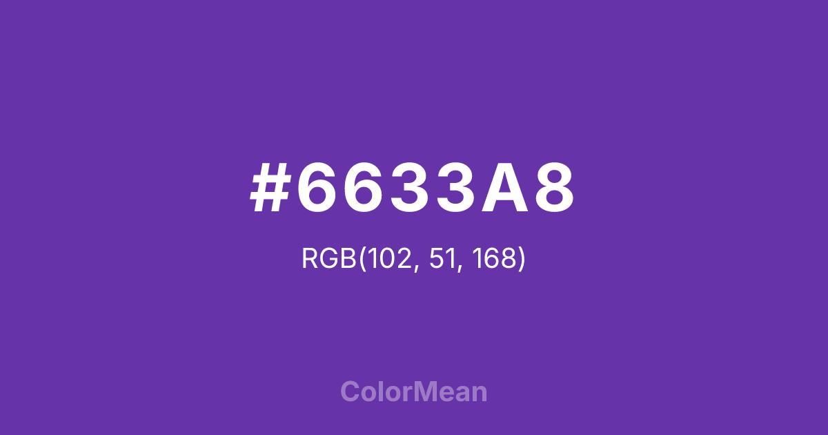 #6633A8 RGB value is (102, 51, 168). The hex color red value is 102, green is 51, and blue is 168. Its HSL format shows a hue of 266°, saturation of 53 percent, and lightness of 43 percent. The CMYK process values are 39 percent, 70 percent, 0 percent, 34 percent.