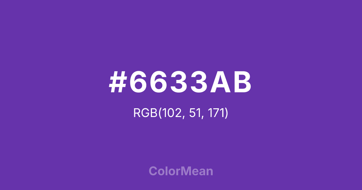 #6633AB RGB value is (102, 51, 171). The hex color red value is 102, green is 51, and blue is 171. Its HSL format shows a hue of 266°, saturation of 54 percent, and lightness of 44 percent. The CMYK process values are 40 percent, 70 percent, 0 percent, 33 percent.