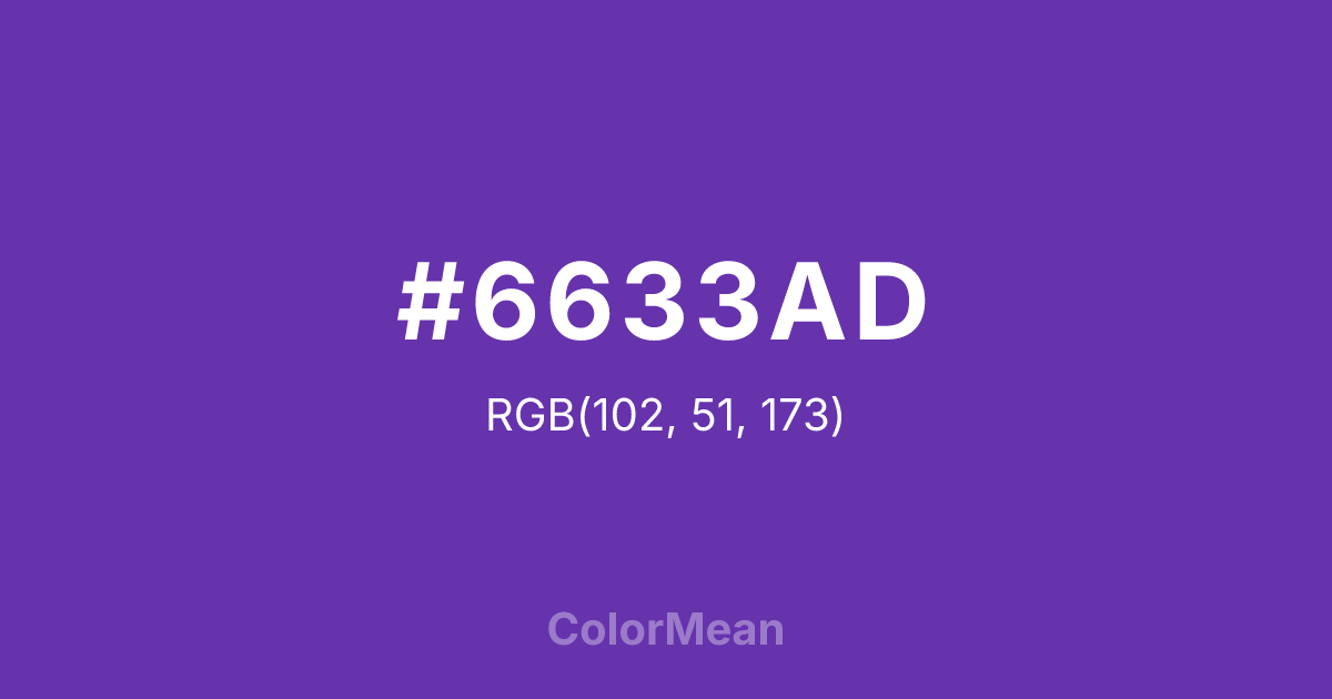 #6633AD RGB value is (102, 51, 173). The hex color red value is 102, green is 51, and blue is 173. Its HSL format shows a hue of 265°, saturation of 54 percent, and lightness of 44 percent. The CMYK process values are 41 percent, 71 percent, 0 percent, 32 percent.