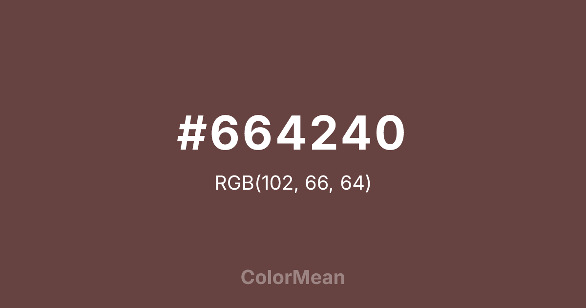 #664240 RGB value is (102, 66, 64). The hex color red value is 102, green is 66, and blue is 64. Its HSL format shows a hue of 3°, saturation of 23 percent, and lightness of 33 percent. The CMYK process values are 0 percent, 35 percent, 37 percent, 60 percent.