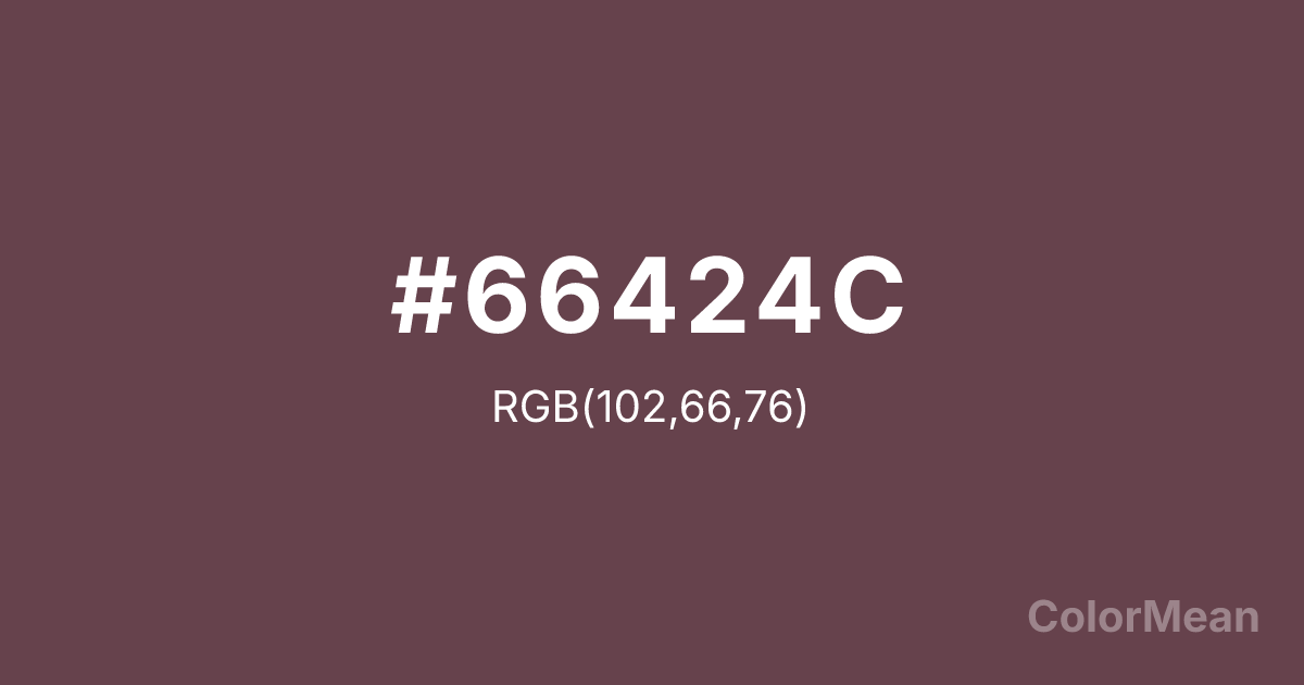 #66424C RGB value is (102, 66, 76). The hex color red value is 102, green is 66, and blue is 76. Its HSL format shows a hue of 343°, saturation of 21 percent, and lightness of 33 percent. The CMYK process values are 0 percent, 35 percent, 25 percent, 60 percent.