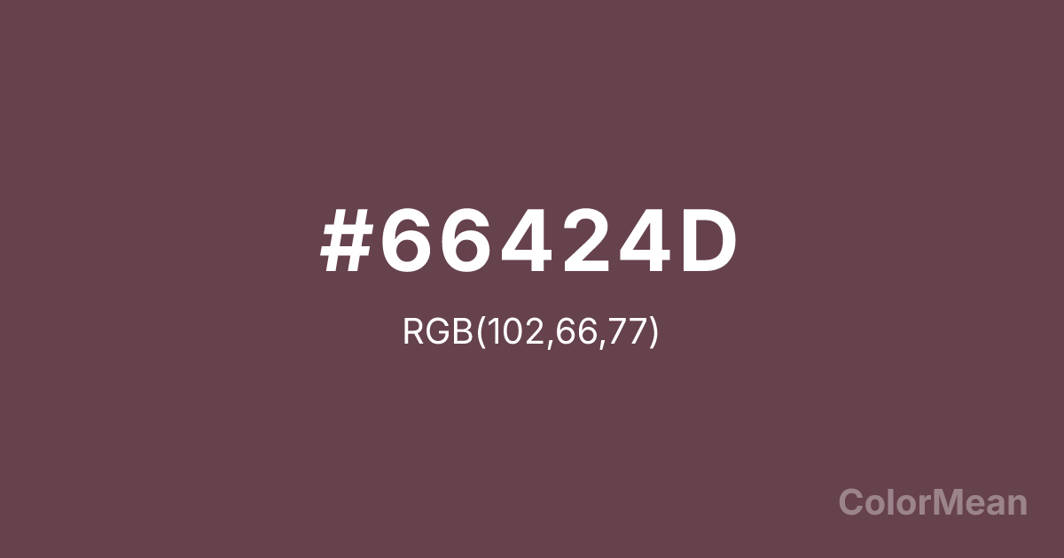 Tuscan Red (#66424D) RGB value is (102, 66, 77). The hex color red value is 102, green is 66, and blue is 77. Its HSL format shows a hue of 342°, saturation of 21 percent, and lightness of 33 percent. The CMYK process values are 0 percent, 35 percent, 25 percent, 60 percent.