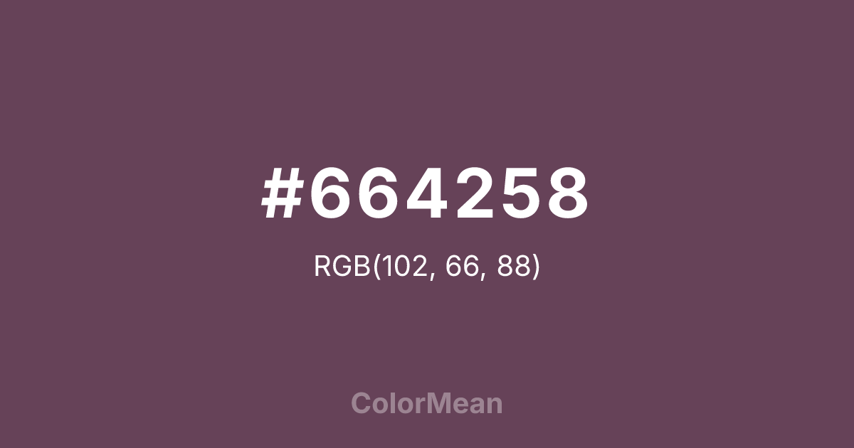 #664258 RGB value is (102, 66, 88). The hex color red value is 102, green is 66, and blue is 88. Its HSL format shows a hue of 323°, saturation of 21 percent, and lightness of 33 percent. The CMYK process values are 0 percent, 35 percent, 14 percent, 60 percent.