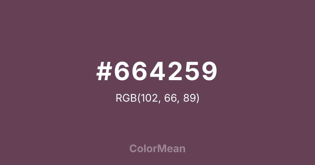 #664259 RGB value is (102, 66, 89). The hex color red value is 102, green is 66, and blue is 89. Its HSL format shows a hue of 322°, saturation of 21 percent, and lightness of 33 percent. The CMYK process values are 0 percent, 35 percent, 13 percent, 60 percent.