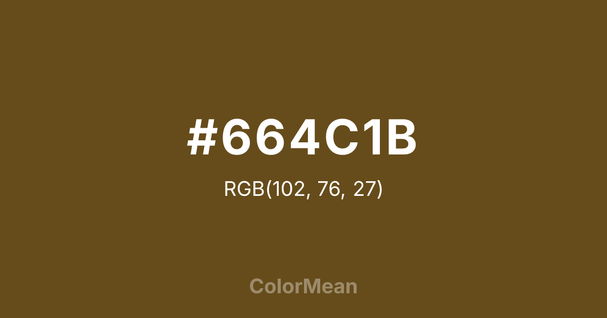 #664C1B RGB value is (102, 76, 27). The hex color red value is 102, green is 76, and blue is 27. Its HSL format shows a hue of 39°, saturation of 58 percent, and lightness of 25 percent. The CMYK process values are 0 percent, 25 percent, 74 percent, 60 percent.