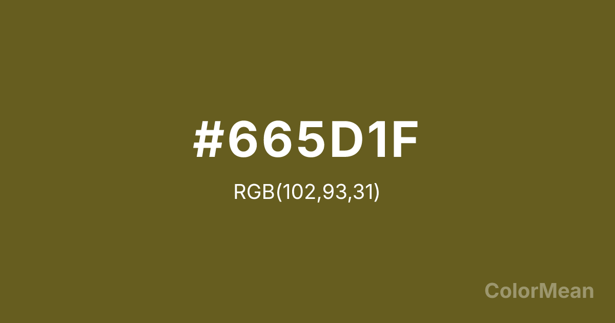 #665D1F RGB value is (102, 93, 31). The hex color red value is 102, green is 93, and blue is 31. Its HSL format shows a hue of 52°, saturation of 53 percent, and lightness of 26 percent. The CMYK process values are 0 percent, 9 percent, 70 percent, 60 percent.