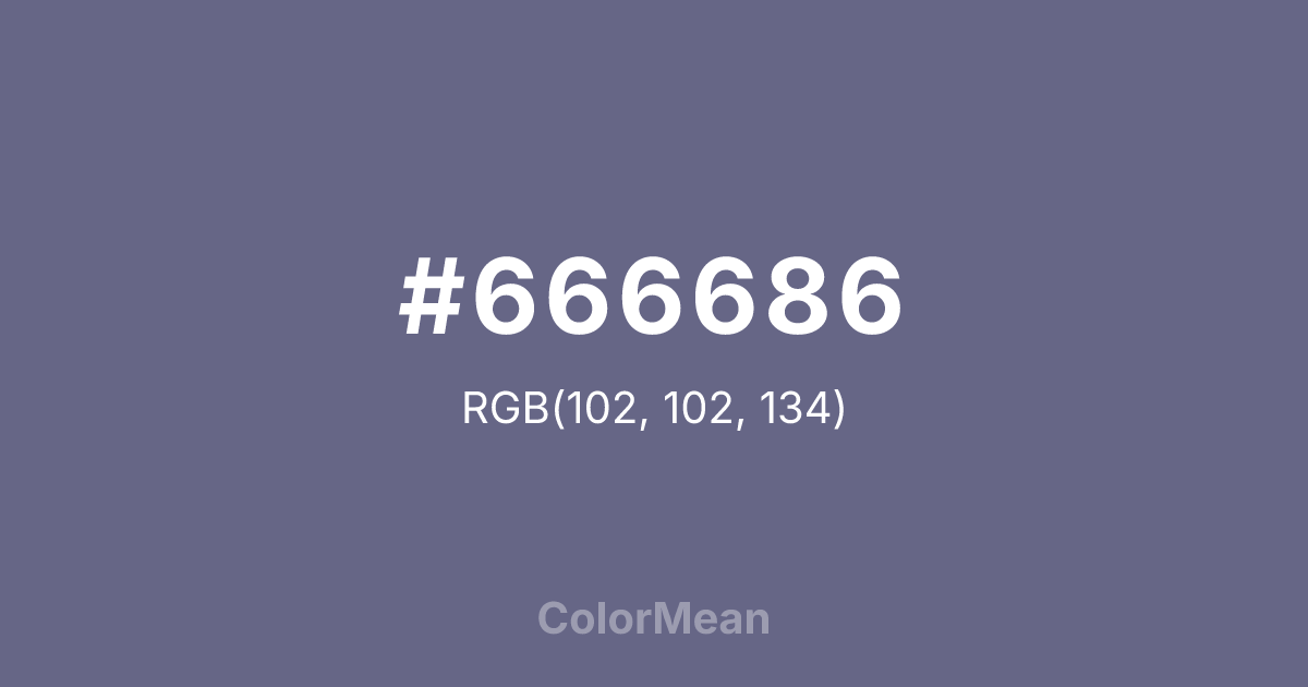 #666686 RGB value is (102, 102, 134). The hex color red value is 102, green is 102, and blue is 134. Its HSL format shows a hue of 240°, saturation of 14 percent, and lightness of 46 percent. The CMYK process values are 24 percent, 24 percent, 0 percent, 47 percent.