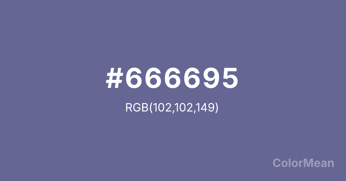 #666695 RGB value is (102, 102, 149). The hex color red value is 102, green is 102, and blue is 149. Its HSL format shows a hue of 240°, saturation of 19 percent, and lightness of 49 percent. The CMYK process values are 32 percent, 32 percent, 0 percent, 42 percent.