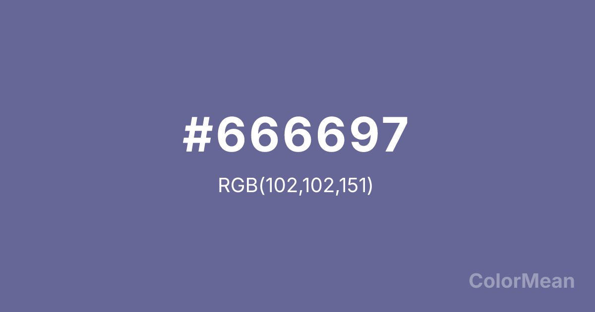 #666697 RGB value is (102, 102, 151). The hex color red value is 102, green is 102, and blue is 151. Its HSL format shows a hue of 240°, saturation of 19 percent, and lightness of 50 percent. The CMYK process values are 32 percent, 32 percent, 0 percent, 41 percent.