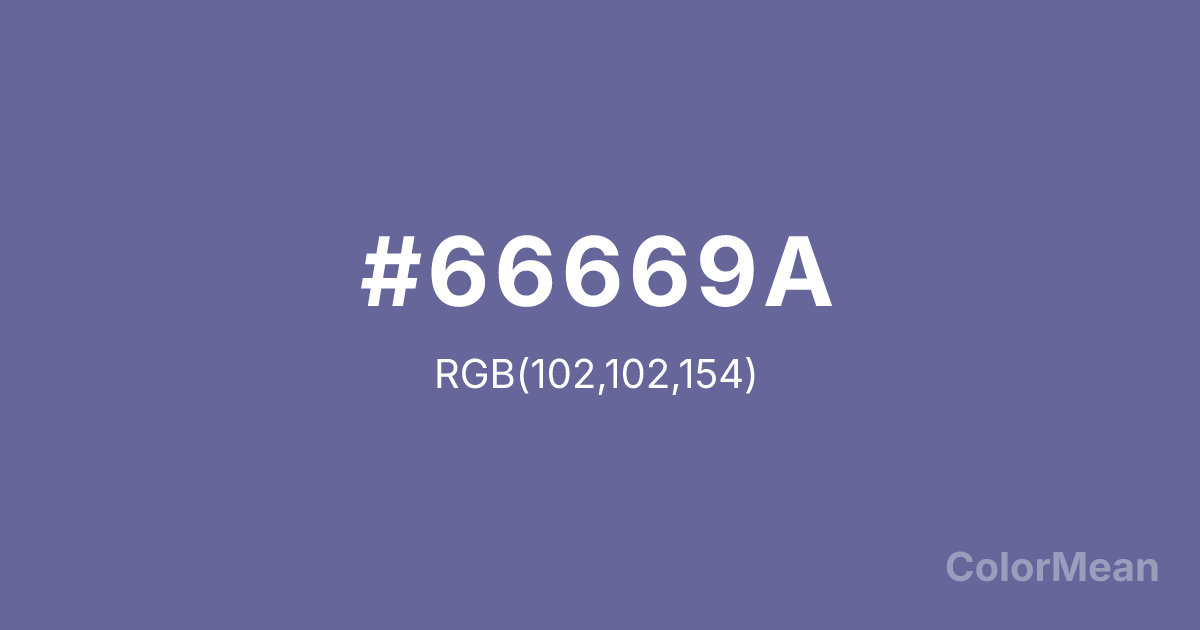 #66669A RGB value is (102, 102, 154). The hex color red value is 102, green is 102, and blue is 154. Its HSL format shows a hue of 240°, saturation of 20 percent, and lightness of 50 percent. The CMYK process values are 34 percent, 34 percent, 0 percent, 40 percent.