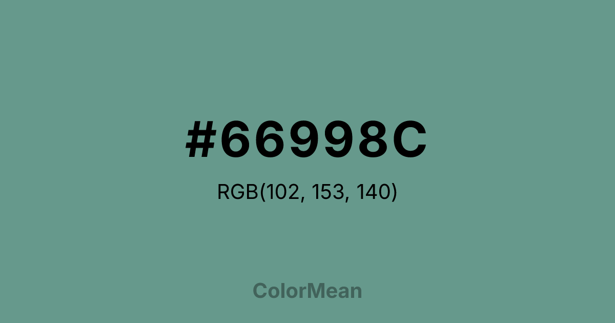 #66998C RGB value is (102, 153, 140). The hex color red value is 102, green is 153, and blue is 140. Its HSL format shows a hue of 165°, saturation of 20 percent, and lightness of 50 percent. The CMYK process values are 33 percent, 0 percent, 8 percent, 40 percent.
