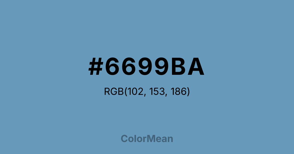 #6699BA RGB value is (102, 153, 186). The hex color red value is 102, green is 153, and blue is 186. Its HSL format shows a hue of 204°, saturation of 38 percent, and lightness of 56 percent. The CMYK process values are 45 percent, 18 percent, 0 percent, 27 percent.