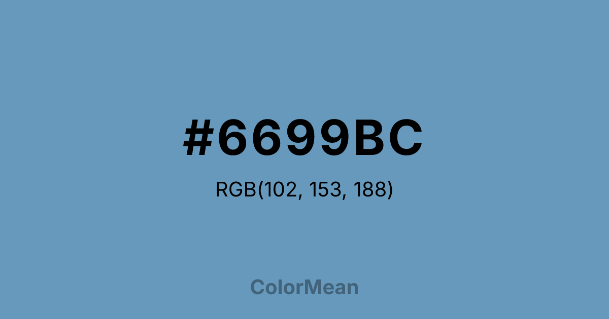 #6699BC RGB value is (102, 153, 188). The hex color red value is 102, green is 153, and blue is 188. Its HSL format shows a hue of 204°, saturation of 39 percent, and lightness of 57 percent. The CMYK process values are 46 percent, 19 percent, 0 percent, 26 percent.