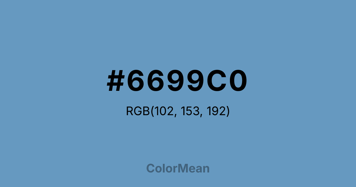 #6699C0 RGB value is (102, 153, 192). The hex color red value is 102, green is 153, and blue is 192. Its HSL format shows a hue of 206°, saturation of 42 percent, and lightness of 58 percent. The CMYK process values are 47 percent, 20 percent, 0 percent, 25 percent.