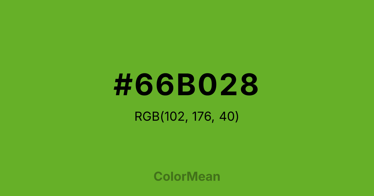 #66B028 RGB value is (102, 176, 40). The hex color red value is 102, green is 176, and blue is 40. Its HSL format shows a hue of 93°, saturation of 63 percent, and lightness of 42 percent. The CMYK process values are 42 percent, 0 percent, 77 percent, 31 percent.