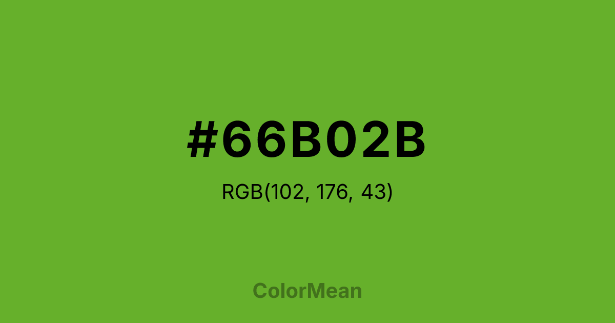 #66B02B RGB value is (102, 176, 43). The hex color red value is 102, green is 176, and blue is 43. Its HSL format shows a hue of 93°, saturation of 61 percent, and lightness of 43 percent. The CMYK process values are 42 percent, 0 percent, 76 percent, 31 percent.