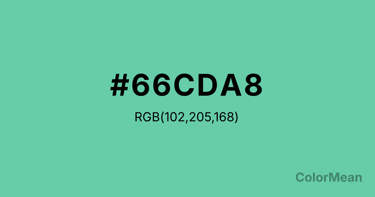 #66CDA8 RGB value is (102, 205, 168). The hex color red value is 102, green is 205, and blue is 168. Its HSL format shows a hue of 158°, saturation of 51 percent, and lightness of 60 percent. The CMYK process values are 50 percent, 0 percent, 18 percent, 20 percent.