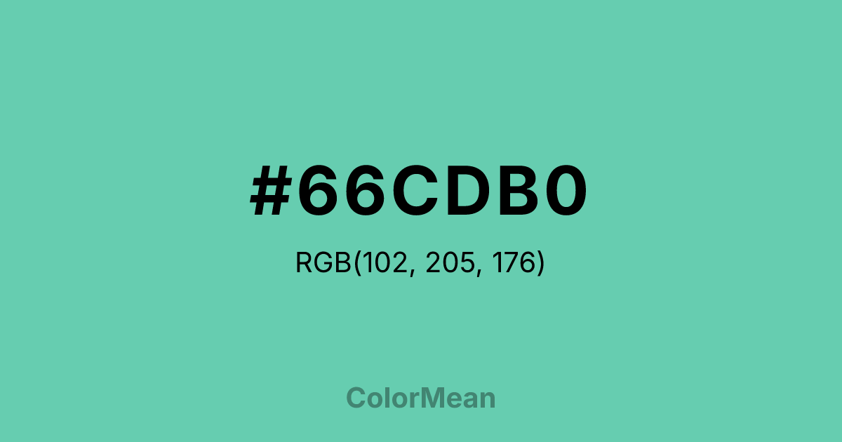 #66CDB0 RGB value is (102, 205, 176). The hex color red value is 102, green is 205, and blue is 176. Its HSL format shows a hue of 163°, saturation of 51 percent, and lightness of 60 percent. The CMYK process values are 50 percent, 0 percent, 14 percent, 20 percent.