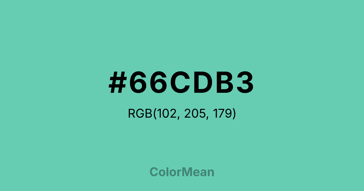 #66CDB3 RGB value is (102, 205, 179). The hex color red value is 102, green is 205, and blue is 179. Its HSL format shows a hue of 165°, saturation of 51 percent, and lightness of 60 percent. The CMYK process values are 50 percent, 0 percent, 13 percent, 20 percent.