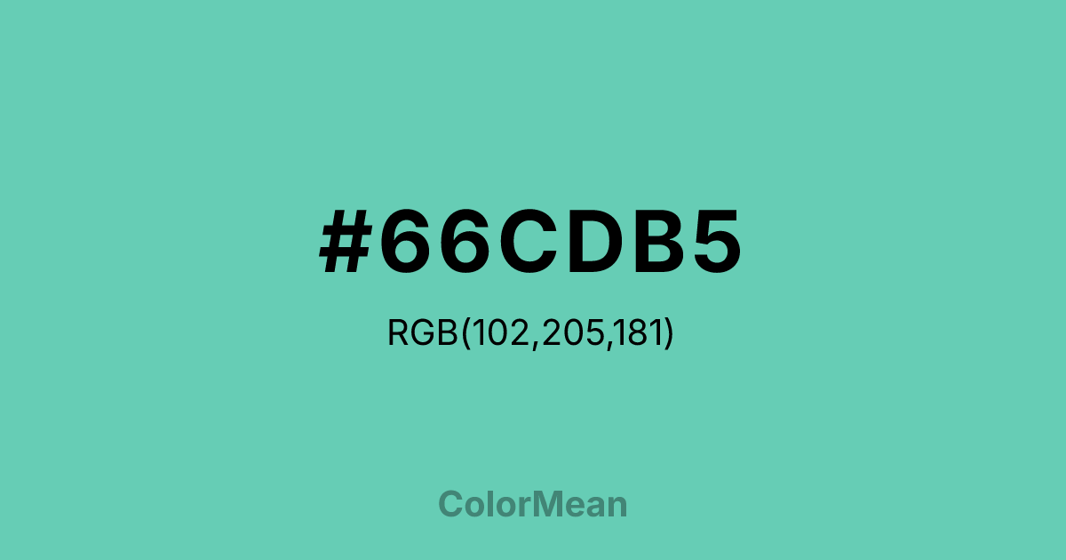 #66CDB5 RGB value is (102, 205, 181). The hex color red value is 102, green is 205, and blue is 181. Its HSL format shows a hue of 166°, saturation of 51 percent, and lightness of 60 percent. The CMYK process values are 50 percent, 0 percent, 12 percent, 20 percent.