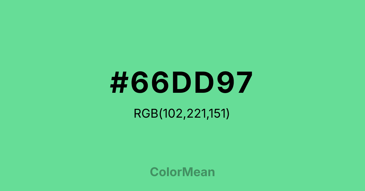 #66DD97 RGB value is (102, 221, 151). The hex color red value is 102, green is 221, and blue is 151. Its HSL format shows a hue of 145°, saturation of 64 percent, and lightness of 63 percent. The CMYK process values are 54 percent, 0 percent, 32 percent, 13 percent.