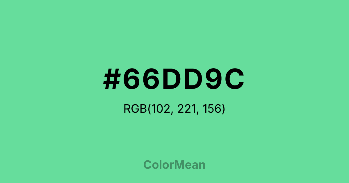#66DD9C RGB value is (102, 221, 156). The hex color red value is 102, green is 221, and blue is 156. Its HSL format shows a hue of 147°, saturation of 64 percent, and lightness of 63 percent. The CMYK process values are 54 percent, 0 percent, 29 percent, 13 percent.