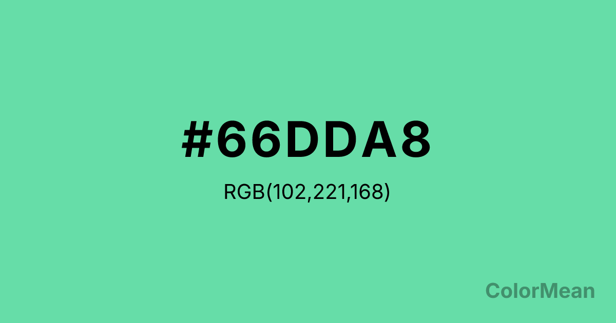 #66DDA8 RGB value is (102, 221, 168). The hex color red value is 102, green is 221, and blue is 168. Its HSL format shows a hue of 153°, saturation of 64 percent, and lightness of 63 percent. The CMYK process values are 54 percent, 0 percent, 24 percent, 13 percent.