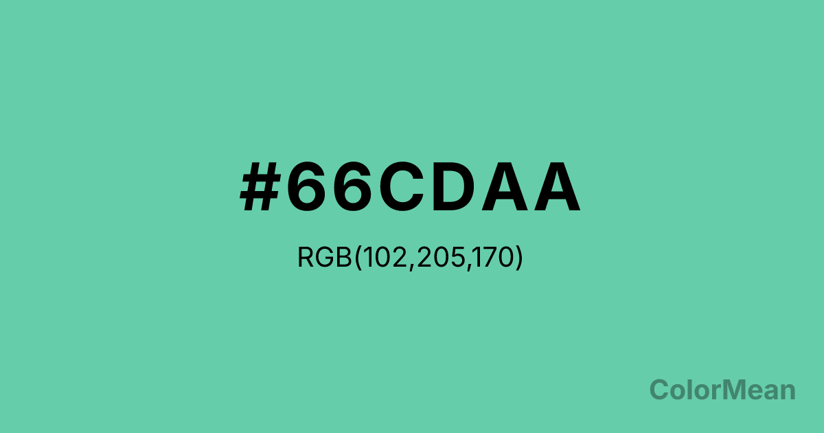 Medium (#66CDAA) RGB value is (102, 205, 170). The hex color red value is 102, green is 205, and blue is 170. Its HSL format shows a hue of 160°, saturation of 51 percent, and lightness of 60 percent. The CMYK process values are 50 percent, 0 percent, 17 percent, 20 percent.