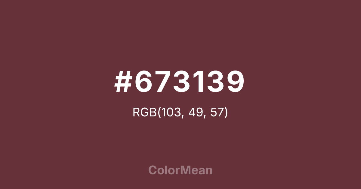 #673139 RGB value is (103, 49, 57). The hex color red value is 103, green is 49, and blue is 57. Its HSL format shows a hue of 351°, saturation of 36 percent, and lightness of 30 percent. The CMYK process values are 0 percent, 52 percent, 45 percent, 60 percent.